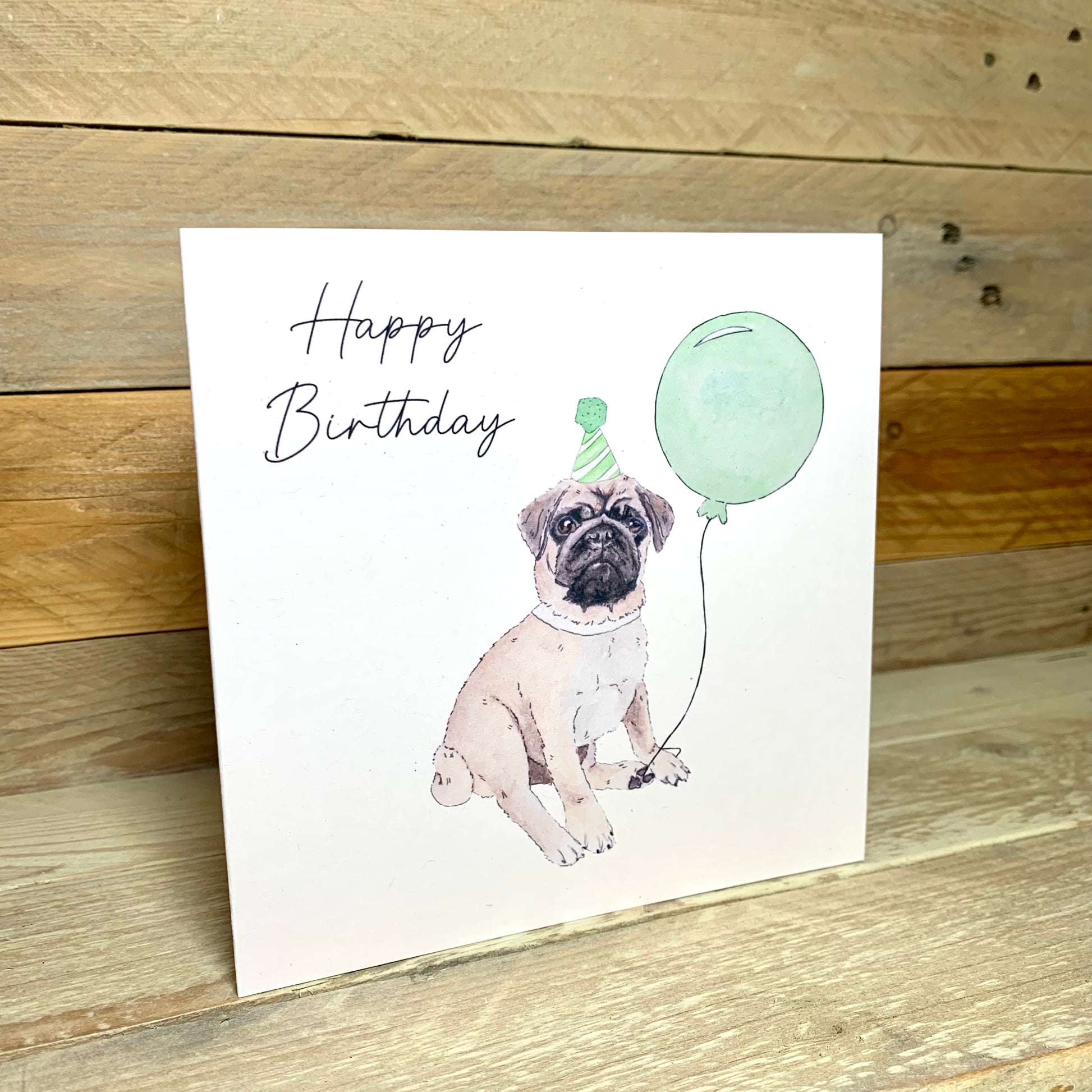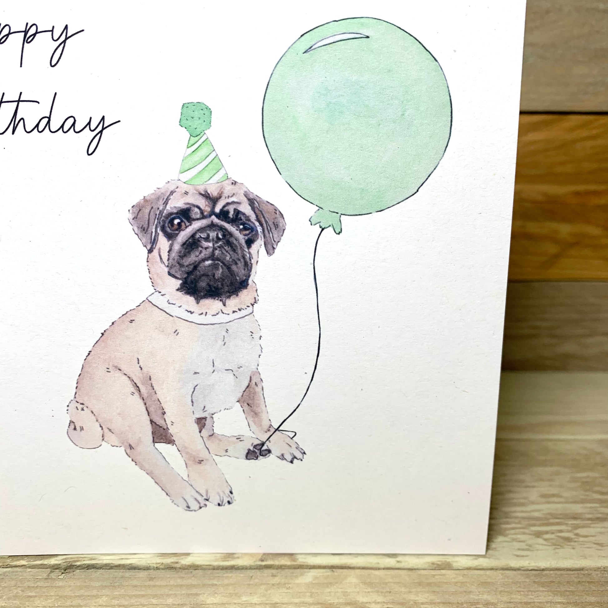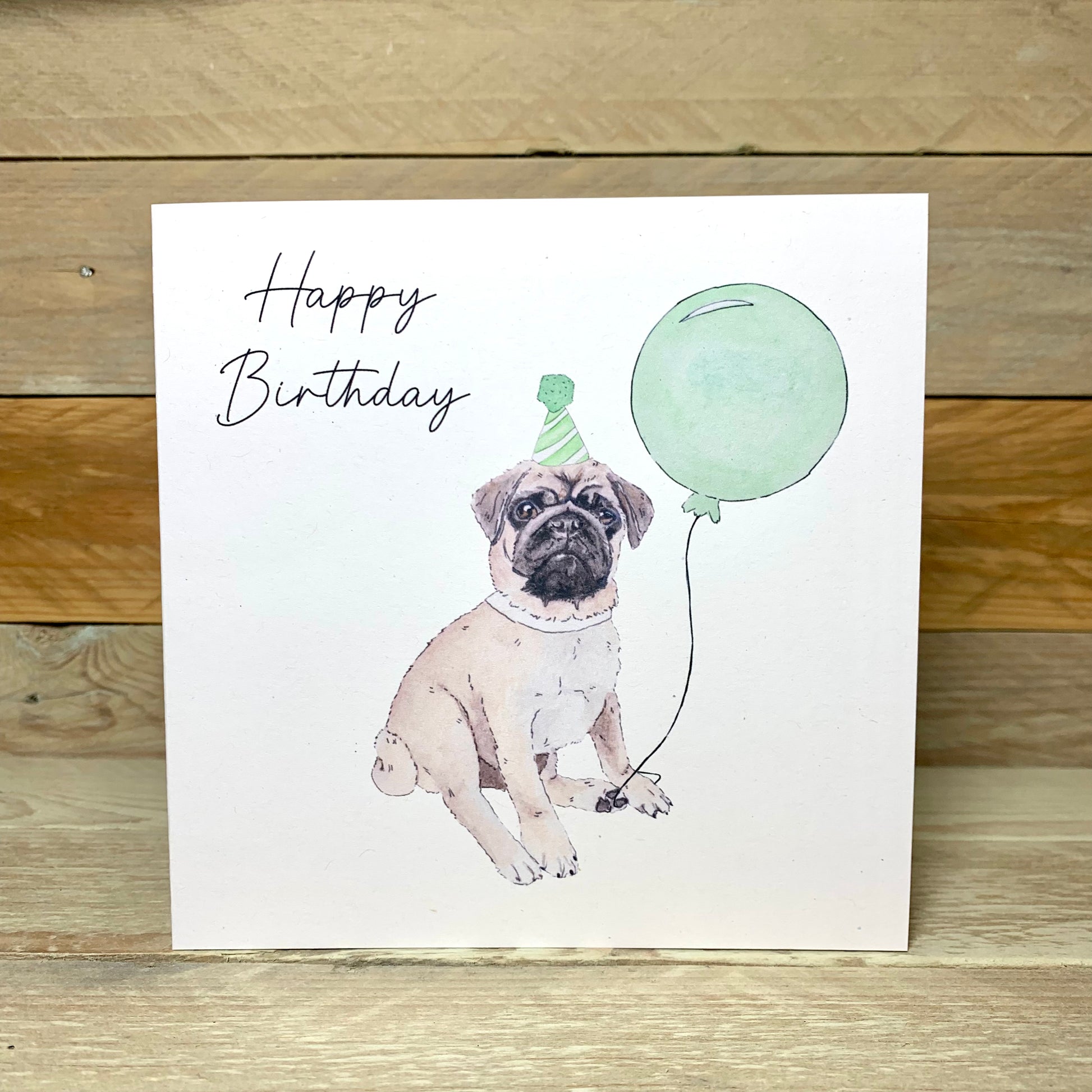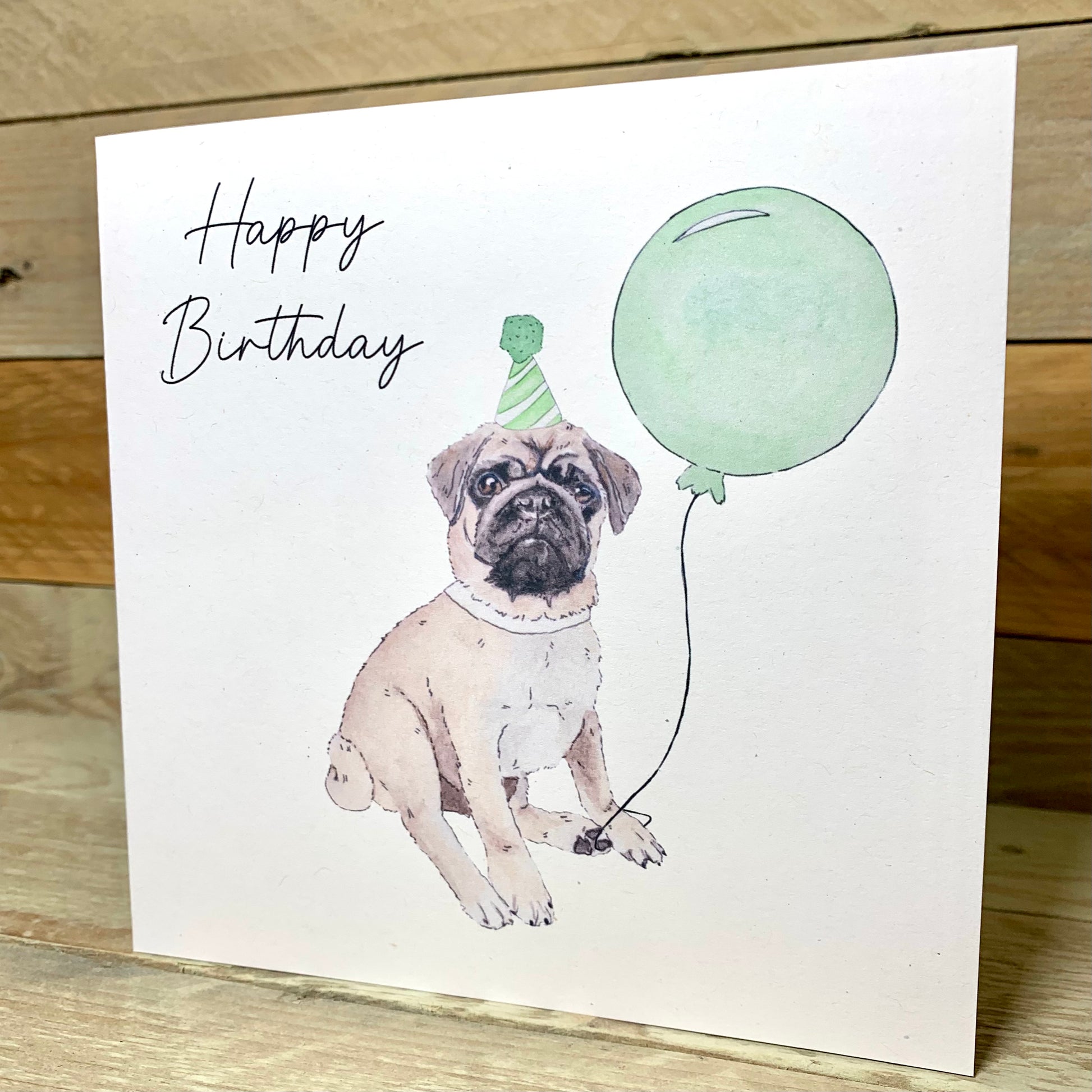 This little pug called Kevin, with a Green Party hat, holding a green ballon creates the best birthday card for any dog lover !
